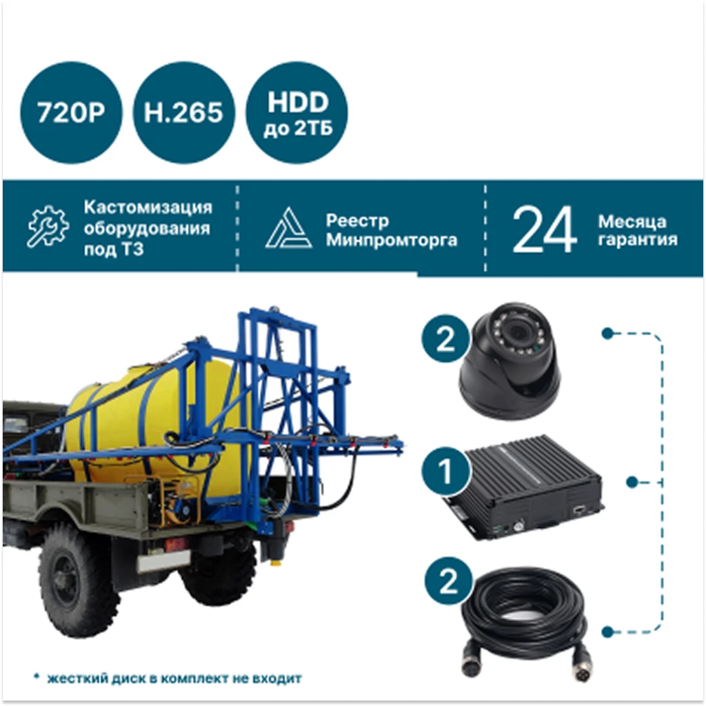 2 камеры Full HD с записью на HDD для сельхозтехники. ИК-подсветка 20м, защита от вибраций, работа в экстремальных условиях.